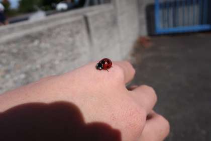 作業に参加した生徒の手には、てんとう虫が心地よさそうにとまっていました。