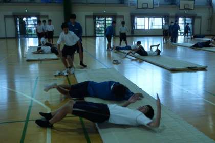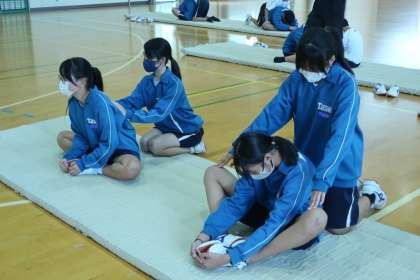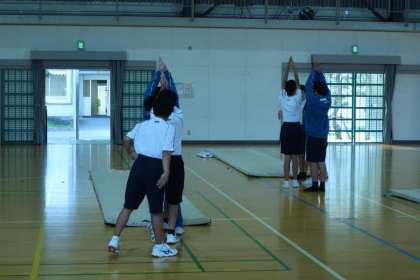 器械運動(マット運動)の単元に入り、様々な準備運動の確認が行われていました。