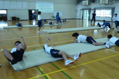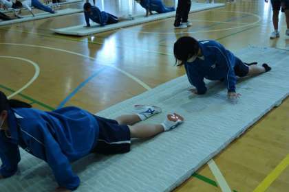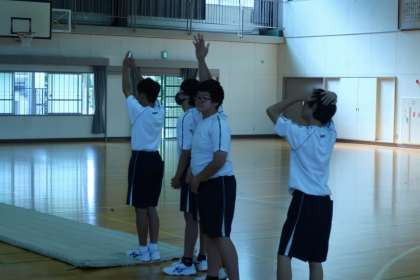 器械運動(マット運動)の単元に入り、様々な準備運動の確認が行われていました。