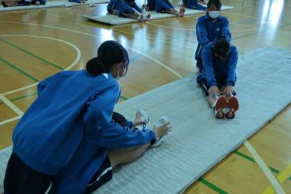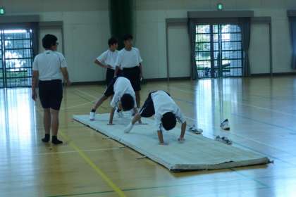器械運動(マット運動)の単元に入り、様々な準備運動の確認が行われていました。