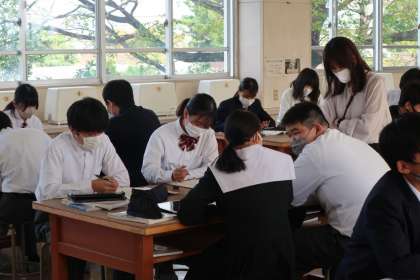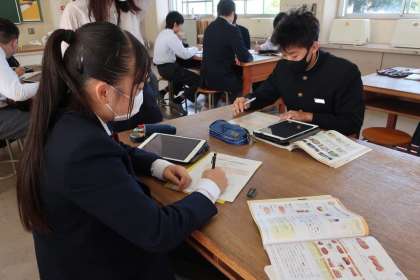 調理実習に向けて、「肉の性質を理解して、より美味しいしょうが焼きをつくろう」をテーマに、アイデアや調理方法などを考えていました。