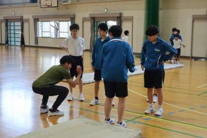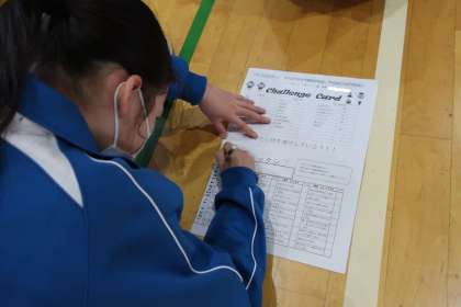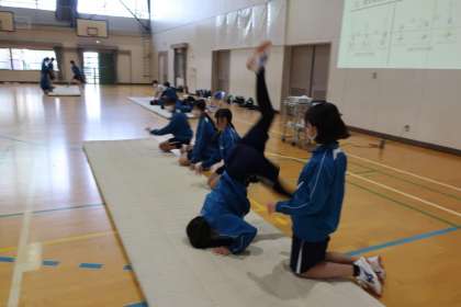 器械運動(マット運動)の学習で、まずは基本の回転運動と三点倒立をマスターしようと活動していました。
