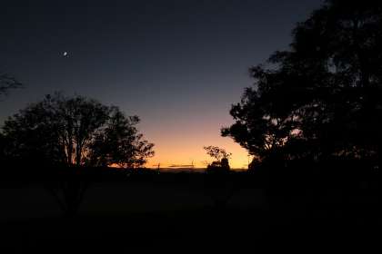 夕焼けがとてもきれいに見えます。また、空には三日月も見えます。