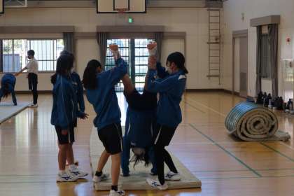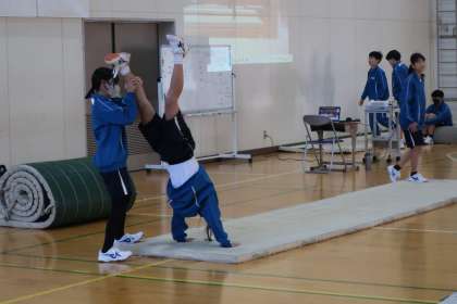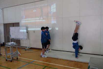 器械運動(マット運動)の学習で、「自分と仲間の倒立の課題を見つけよう」をテーマに技の向上に向けて取り組んでいました。