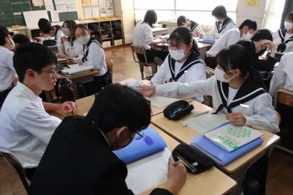 四角形に関する比の演習問題に取り組み、理解できているかどうかを仲間と確認し合っていました。