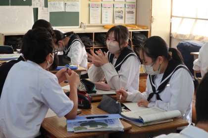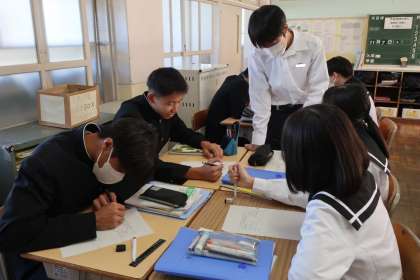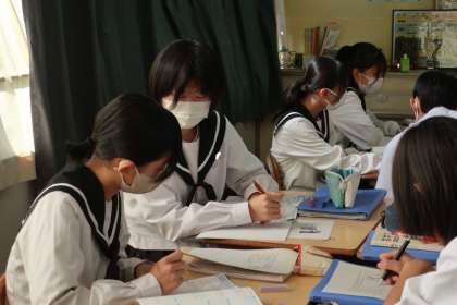 四角形に関する比の演習問題に取り組み、理解できているかどうかを仲間と確認し合っていました。
