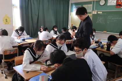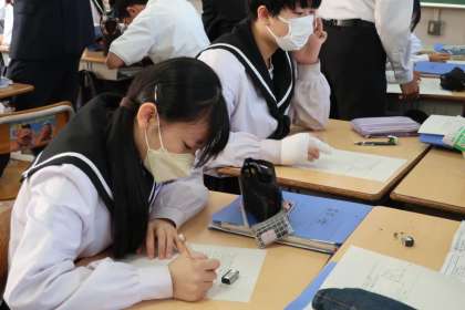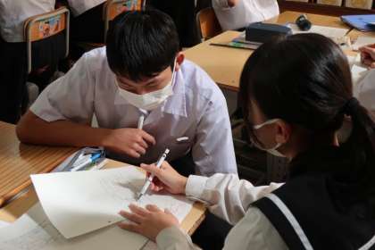 四角形に関する比の演習問題に取り組み、理解できているかどうかを仲間と確認し合っていました。