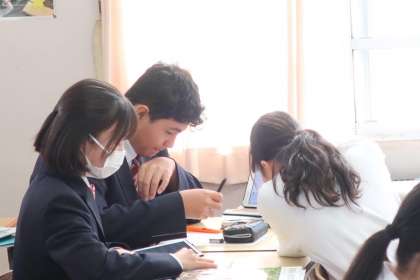 「クラスメイトについてクイズをしよう」をテーマに、紹介文を考えたり、よい発音で発表できるように練習していました。
