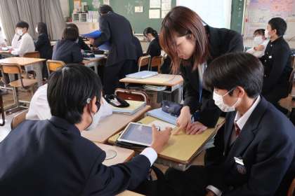 11/8 2-4 仲間に説明 2 公開日 2024/11/08 更新日 2024/11/08 各学年から 昨日の学校訪問(教育委員会による授業参観)で公開された授業の様子をお届けします。 2年4組の数学の授業の様子です。 「星形の先端にできる5つの角の和の求め方を説明しよう」をテーマに、グループで意見の交流が行われていました。
