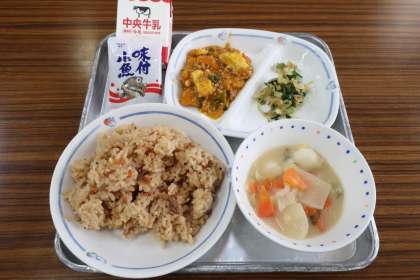 米粉だんご汁、ほうれんそうのおかかあえ、生揚げとかぼちゃのそぼろ煮、乾燥小魚、ごはん、牛乳 でした。