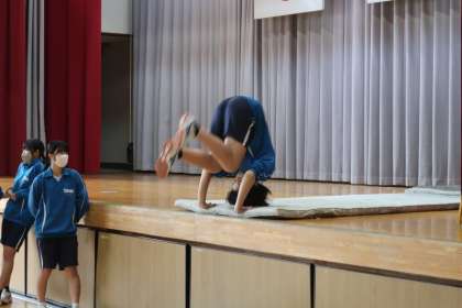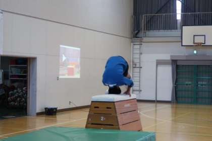 器械運動の跳び箱の学習で、開脚跳び、閉脚跳び、台上前転、フッドスプリングなど、各自が習得したい技を仲間の力を借りながら練習していました。