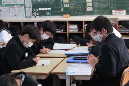 円周角、二次方程式… 定期テストに出題範囲の対策プリントの問題をどんどん解いていきます。「調子出てきたー!」の言葉に頼もしさを感じました。