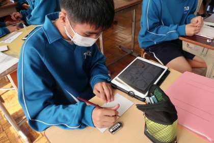 11/11 2-5 サインボードづくり 2 公開日 2024/11/11 更新日 2024/11/11 各学年から 2年5組の美術の授業の様子です。 自身の名前をアルファベットで表した「サインボード(表札)」づくりに取り組んでいました。仲間からアイデアをもらったり、作品を参考にしたりして、楽しみながら取り組んでいました。