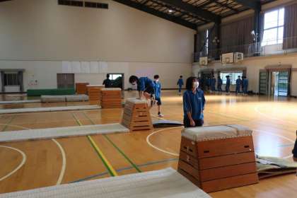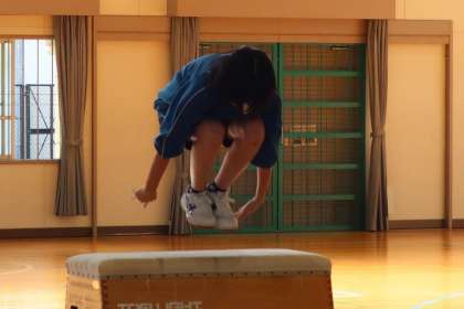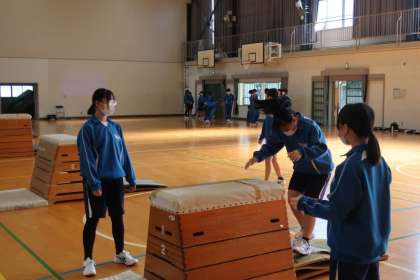 器械運動の跳び箱の学習で、開脚跳び、閉脚跳び、台上前転、フッドスプリングなど、各自が習得したい技の練習に意欲的に取り組んでいました。