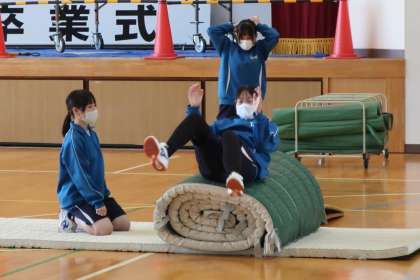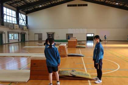 器械運動の跳び箱の学習で、開脚跳び、閉脚跳び、台上前転、フッドスプリングなど、各自が習得したい技の練習に意欲的に取り組んでいました。