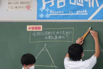 「合同な図形をかくための条件」をテーマに、三角形の合同条件で必要な事項を探していました。