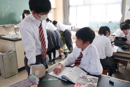 11/13 1-1 前向きに学習 2 公開日 2024/11/13 更新日 2024/11/13 各学年から 1年1組の理科の授業の様子です。 限られた時間の中でのテスト勉強。先生や仲間に教えてもらいながら、理解が不十分な部分を克服しようとしていました。