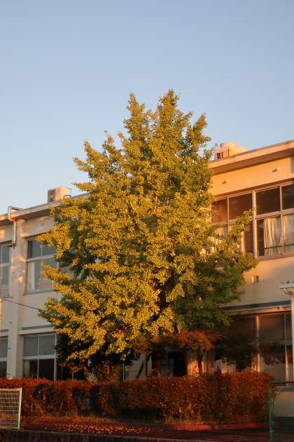 朝日に浮かび上がる学校の様子です。鮮やかなオレンジ色の光が校舎や木々を照らしている様子は、まさに天然のライトアップ。紅葉の名所に負けない光景が見られたことに少し感動すら覚えます。