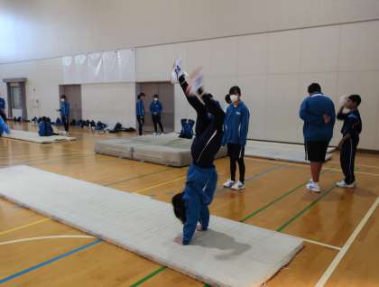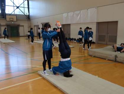 器械運動(マット運動)の学習で、これまで練習してきた成果を発表したり、仲間にアドバイスをもらいながら、技のレベルアップに向け一生懸命練習していました。
