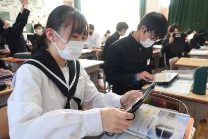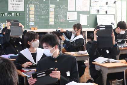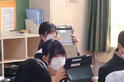 天体の学習で、「太陽の一日の動きをまとめよう」をテーマに、学習用タブレットにある天体学習アプリが紹介され、家庭でも観察できる方法を確認していました。