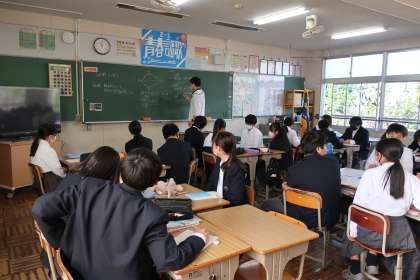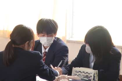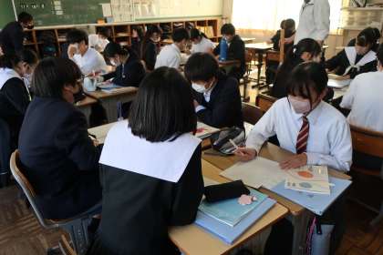 三角形の証明問題に取り組んでいました。仲間同士で解き方を説明し合っています。