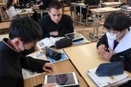 生産と労働についての学習で、「利潤を生み出す企業をつくろう」をテーマに、グループごとにアイデアを出し合いながら、儲かる企業の立ち上げに盛り上がっていました。