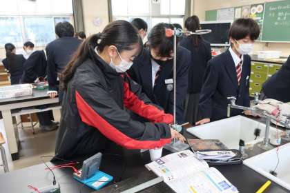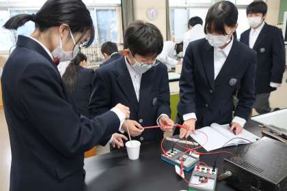 「電力の大きさや電流を流す時間を変えると、水の温度はどのように変わっていくか」をテーマに、電力の大きさと水の温度変化の関係を調べるための実験に取り組んでいました。