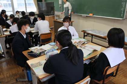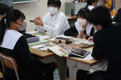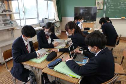 「東北地方の気候と人々のくらし」の学習で、グループごとに各県特有の「祭り」について詳しく調べていました。
