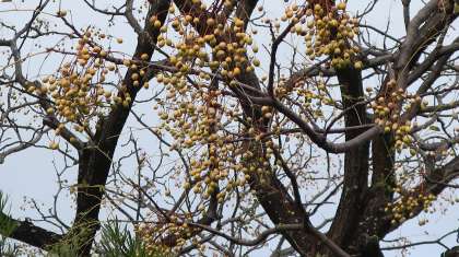 センダンのみはこれから少しずつ白色に変化していきます。これをドライフラワーとして活用する人も多いとか。また、葉や実、樹皮は、虫よけ、しもやけやあかぎれ、虫下しなどに対処する薬用の部分がある一方、実は人や家畜が食べると中毒症状を起こす場合があります。薬用植物と有毒を合わせもつ樹木です。