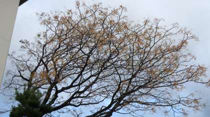 3棟の東側に植わるセンダンの木。現在は黄色の実をたくさんつけています。初夏には藤色の美しい小さな花をたくさん咲かせ、バニラやチョコレートのような甘い香りを漂わせています(実際には、花の咲く位置が高く、はっきりとその香りを楽しむのは難しいですが…)。