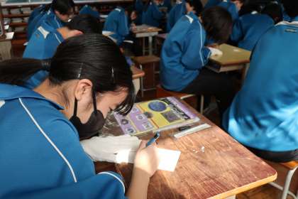 自身の名前をアルファベットで表した「サインボード(表札)」づくりに取り組んでいました。先生からアイデアをもらったり、仲間の作品を参考にしたりして、楽しみながら取り組んでいました。