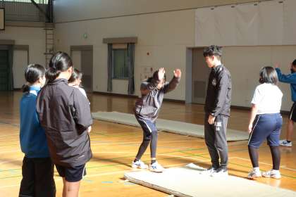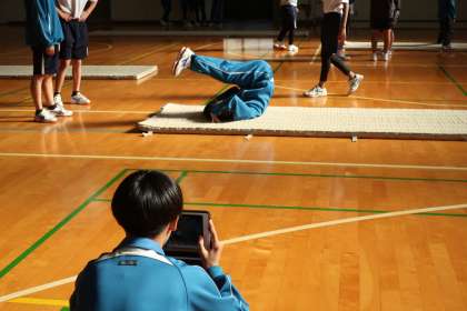 マット運動の学習で、前転系の技の完成度を上げるため、タブレットで動画を撮りながらアドバイスをしていました。