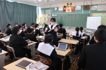 「株価の変動と株主の利益を考えよう」をテーマに、グループごとに立ち上げた企業の株を買い、変動する株価を確認しながら、株投資の体験を行っていました。