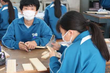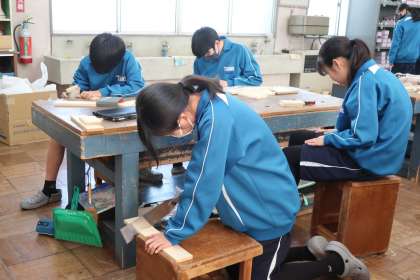 木製品(小物仕分け箱)づくりに取り組んでいました。紙やすりやキリといった手作業のもののほか、ベルトサンダーなどの機械を使った作業にも取り組んでいました。