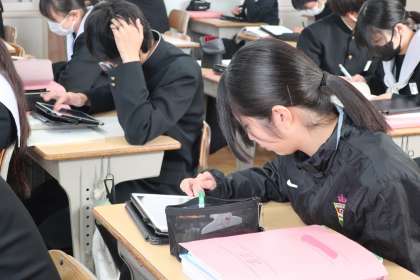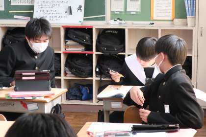 「いにしえの心を受け継ぐ」と題して、短歌で相手に想いを伝える学習に取り組んでいました。限られた文字数で好きな人へのラブレターを考えていました。