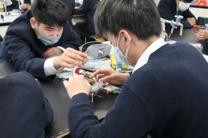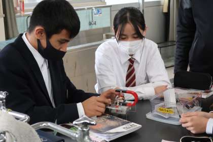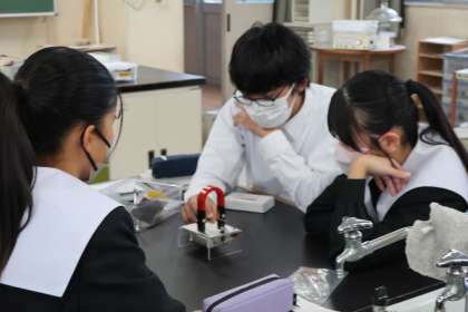 磁界の学習で、モーターが動く原理を学んだあと、その原理が正しいかどうかを実験で確かめていました。