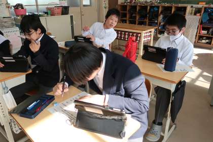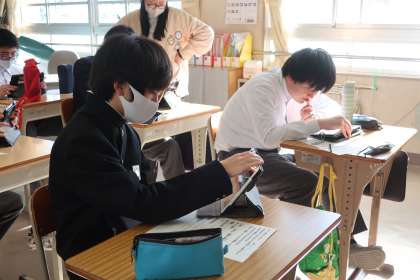 前回までの授業で、自身や家事の際の対応の仕方を学んだ生徒たち。今回はその対応のために有効な『防災グッズ・非常食』について調べていました。自分や家族を守ることを考えながら、意欲的に活動していました。