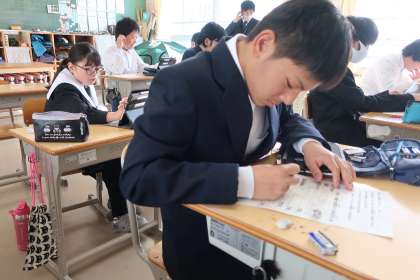 前回までの授業で、自身や家事の際の対応の仕方を学んだ生徒たち。今回はその対応のために有効な『防災グッズ・非常食』について調べていました。自分や家族を守ることを考えながら、意欲的に活動していました。
