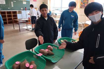 学級菜園で収穫したさつまいもや落花生、また、たくさん拾った銀杏などの販売を行った1,2学級の生徒。手作りのチラシ、サツマイモのツルで作ったクリスマスリース、松ぼっくりのミニツリーなど、本当に丁寧に作られていました。