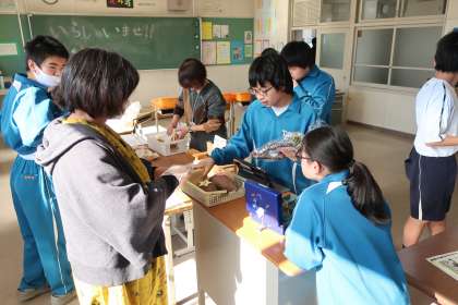 学級菜園で収穫したさつまいもや落花生、また、たくさん拾った銀杏などの販売を行った1,2学級の生徒。手作りのチラシ、サツマイモのツルで作ったクリスマスリース、松ぼっくりのミニツリーなど、本当に丁寧に作られていました。