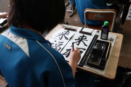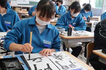 冬休み明けに行われる『書き初め大会』に向けての練習が始まっていました。2年生の課題は『笑門来福』です。