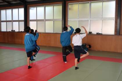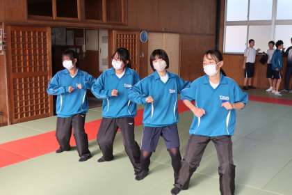 全グループ共通の課題のダンスを映像を見ながら一生懸命練習しています。自分たちのダンスの様子をタブレットで撮影し、完成度を高めています。