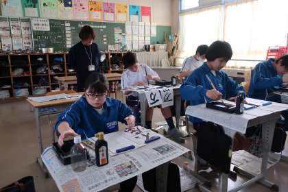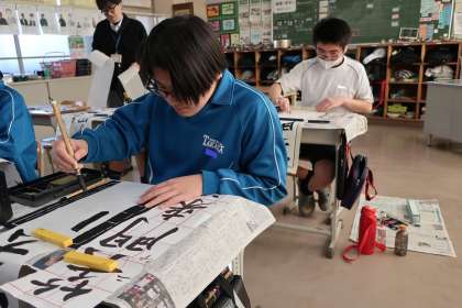 書き初め大会に向けての練習が始まりました。手本をよく見て、一文字ずつ丁寧に筆を走らせていました。