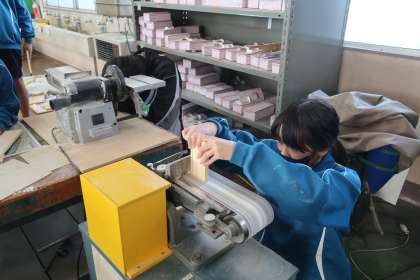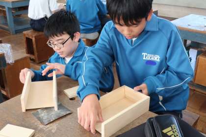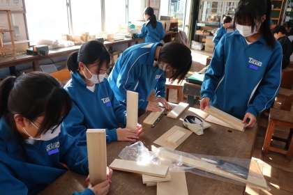 木製品(小物仕分け箱)づくりに取り組んでいました。紙やすりやキリといった手作業のもののほか、ベルトサンダーなどの機械を使った作業にも取り組んでいました。ミリ単位の調整の難しさを体験し、職人さんのスゴさを実感しているようでした。