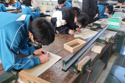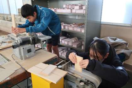 木製品(小物仕分け箱)づくりに取り組んでいました。紙やすりやキリといった手作業のもののほか、ベルトサンダーなどの機械を使った作業にも取り組んでいました。ミリ単位の調整の難しさを体験し、職人さんのスゴさを実感しているようでした。
