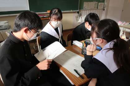 昨日取り組んだ学習診断テストの問題を解き直していきます。正解を導き出すための解き方のポイントをグループで出し合い、発表していきます。仲間の考え方を参考に、入試本番では納得のいく点数が取れることを期待したいと思います。