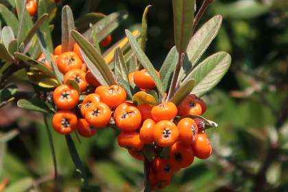 「ピラカンサ」は「ピラカンサス」とも言い、和名は「常盤山査子(トキワサンザシ)」や「橘擬き(タチバナモドキ)」と呼ばれています。初夏に真っ白なかわいらしい花をたわわに咲かせ、秋から冬にかけては、枝をしならせるほどにオレンジや赤い実をつけていきます。濃い緑色の葉とのコントラストが美しいですが、実は枝や幹には鋭いとげがあり、不用意に触ると痛い思いをしてしまいます。