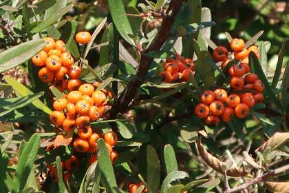 東門を出た国道沿いの側道には、鮮やかなオレンジ色のピラカンサの実を見つけることができます。