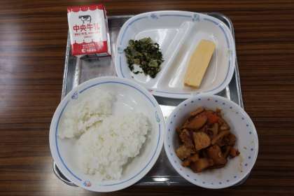 根菜のみそ煮、七草ごはん、厚焼き卵、プチゼリー(アセロラ)、牛乳 でした。