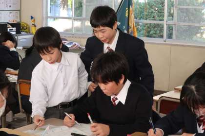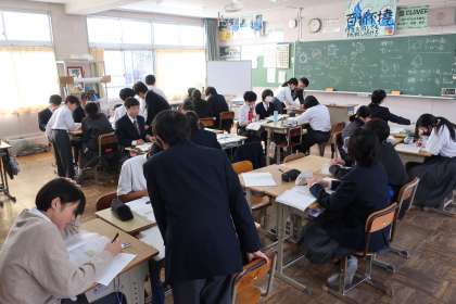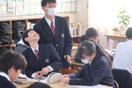 これまでの学習の総まとめとして、章末問題に取り組んでいました。自分から先生や仲間に確認しに行ったり、仲間の困っている様子にすぐに反応して教えに行ったりしています。
